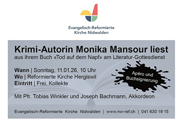 Spannung und Gänsehaut-Feeling pur denn es geht um das Buch «Tod auf dem Napf» von Monika Mansour. Die Schriftstellerin wird vor Ort aus Ihrem Buch vorlesen. Im Anschluss besteht die Möglichkeit das Buch zu kaufen und signieren zu lassen. Joseph Bachmann begleitet den Gottesdienst musikalisch mit dem Akkordeon. Zum anschliessende Apéro sind alle herzlich eingeladen
